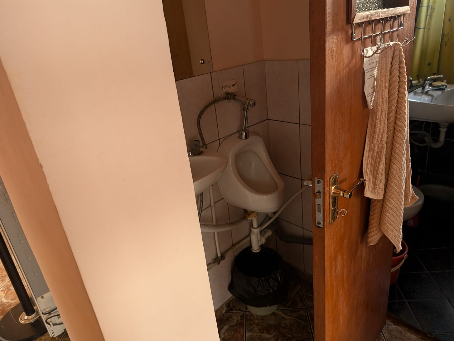 By the time the sun rose the mercury had already hit 36°C. Waking up in a sweat from a night of short, fitful bouts of sleep, I knew a shower was both necessary and futile. On my short stumble to the bathroom I noticed one of the flat’s many hidden quirks, all but invisible in the previous night’s darkness: A urinal with a sink next to it, in the hallway just outside of the bathroom, with a tightly fitted accordion-style door for privacy. Why not? Taking the urinal for an early morning test ride, I was a bit surprised (and more than a bit uncomfortable) to find that closing the accordion door left little more than a foot’s width of free, manoeuvrable space. Cozy is one way to look at it, unsanitary is another. Sidestepping into the actual bathroom I quickly discovered there would be no trace of hot water for the shower. Given the almost 40°C heat, I really didn’t mind.