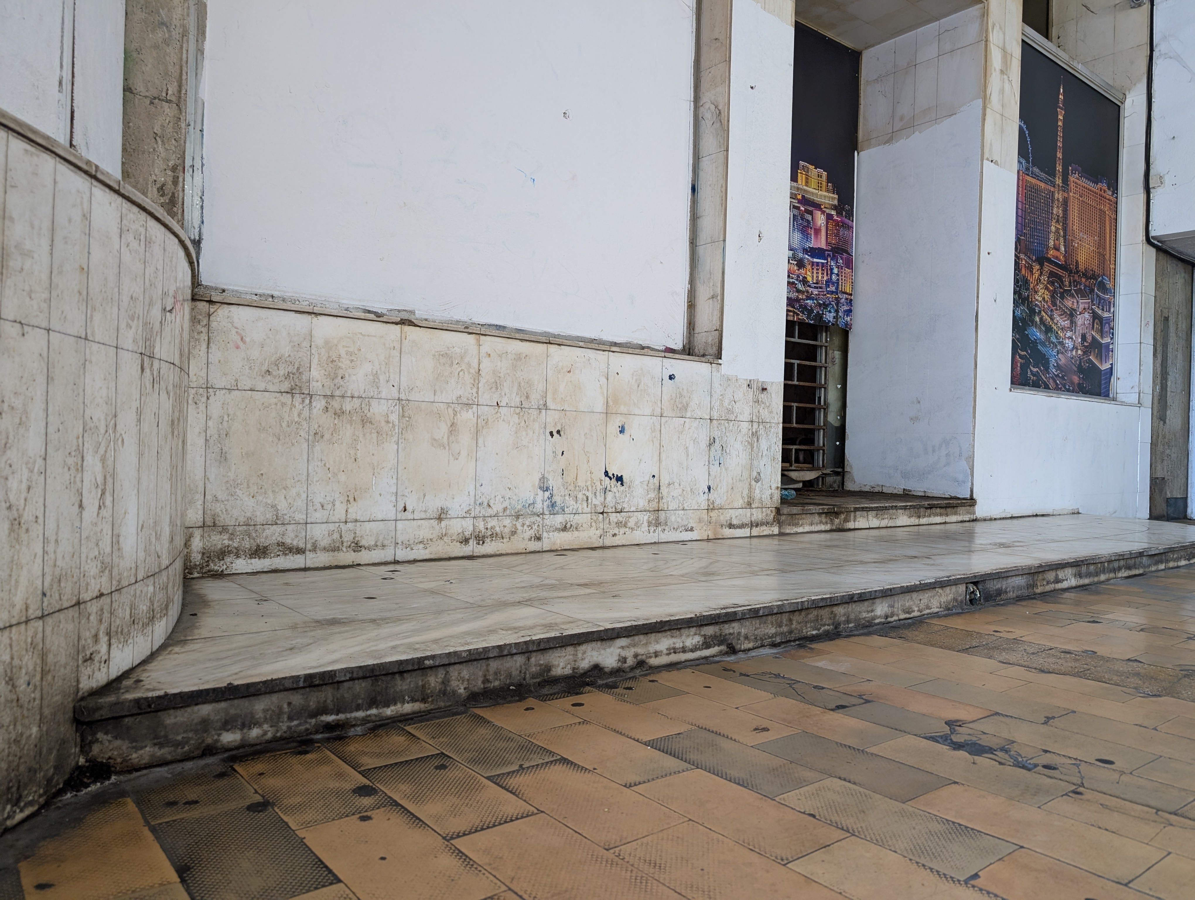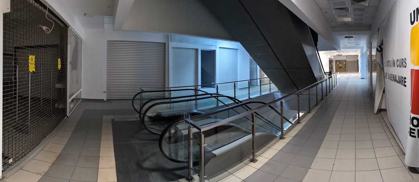 Bucharest has many beautiful parts. My mission took me through none of them. In fact, some of the sectors I travelled through were downright dystopian. Taking the tram through town I’d catch the occasional glimpse of the odd building with a caved-in roof, as though the Nazis had just bombed. Walking towards the downtown core I felt as though the streets may as well be paved in cigarette butts. Passing a person using a bench for a bed and an empty beer bottle for a pillow, I desperately sought refuge from what was now the 44℃ heat. I came across the all but abandoned Unirii Shopping Mall and entered in search of AC, I’ll let the pictures speak for themselves.