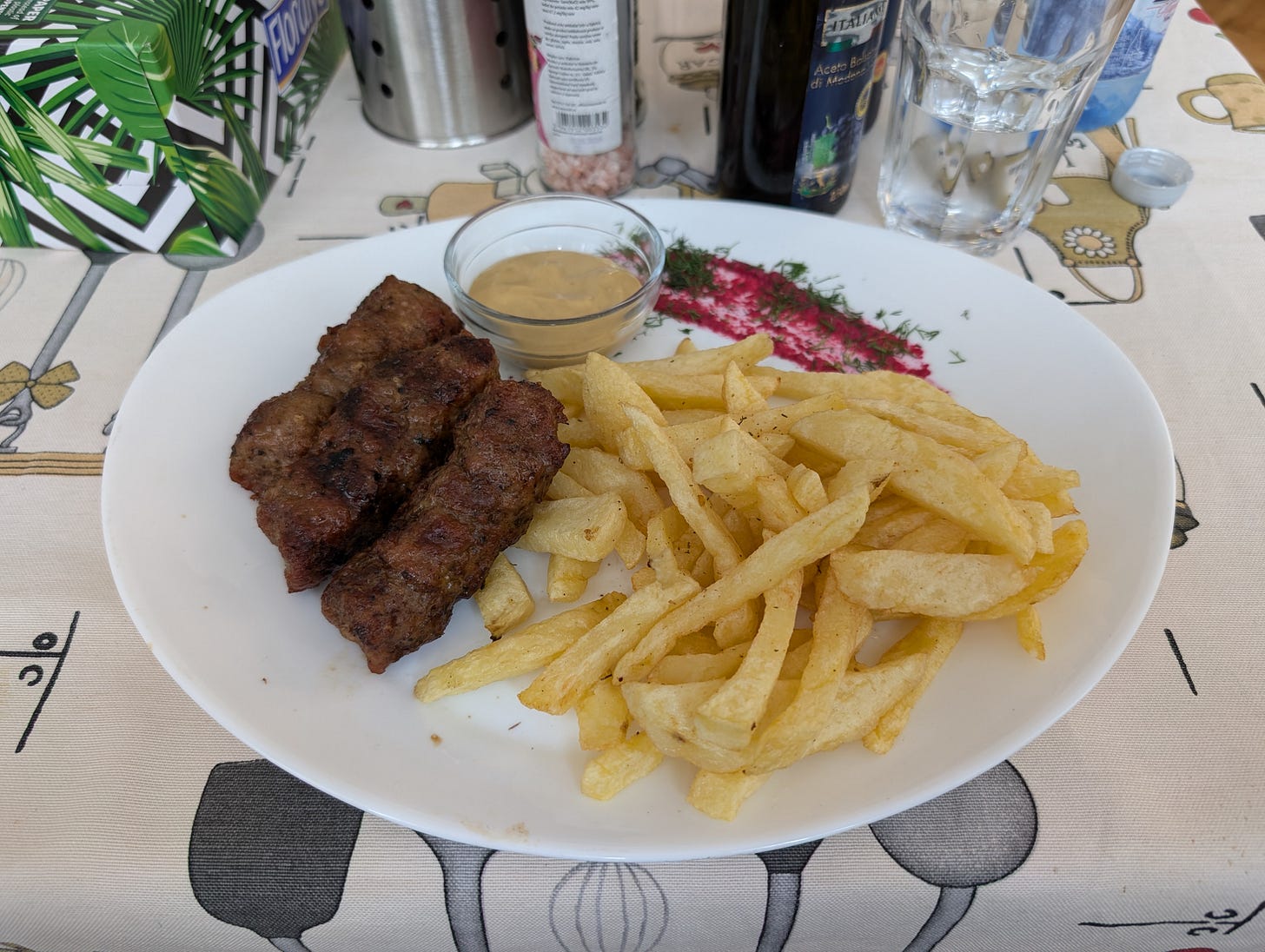 Though I failed in my mission I decided to make the most of what’s left of my day and figure out the rest that night. It must be said, for all the frustrations I encountered, I managed to maintain a level head, and eventually, an upbeat outlook. Almost six months into my new meds I can’t help but wonder how much of this resilience is due to the meds themselves, and how much of it has been there all along. It was time to treat myself, and in Romania one of the best ways to do that is through food. A few short minutes of Google Mapping turned up this gem, and I set out in search of mititei, colloquially known as mici, grilled rolls of ground lamb,beef, and pork (though who knows in what ratio) with spices, mostly garlic. And goddam, those mici hit the spot. That spot being my expanding waistline.
